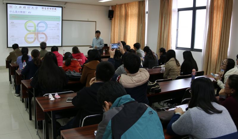 10月31日,江西财经大学信息管理公司学术委员会主任、首席教授万常选做客管科论坛,在燕山校区逸夫教学楼610室为公司教师和研究生做了题为“互联网+时代的大数据应用:机遇与挑战”的学术报告。经理张新、部分系主任、教师和研究生参加活动。经理助理刘位龙主持了报告。