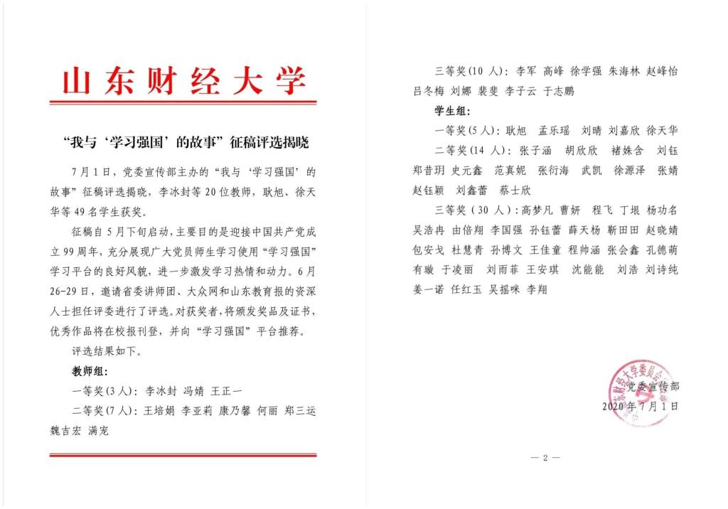 近日,公司党委宣传部主办的“我与‘学习强国’的故事”征稿评选落下帷幕。经山东省委讲师团、大众网和山东教育报专家评选,教师组全校20名教师获奖,其中一等奖3名,二等奖7名,三等奖10名。公司教师冯婧、何丽、李军分别荣获一、二、三等奖。