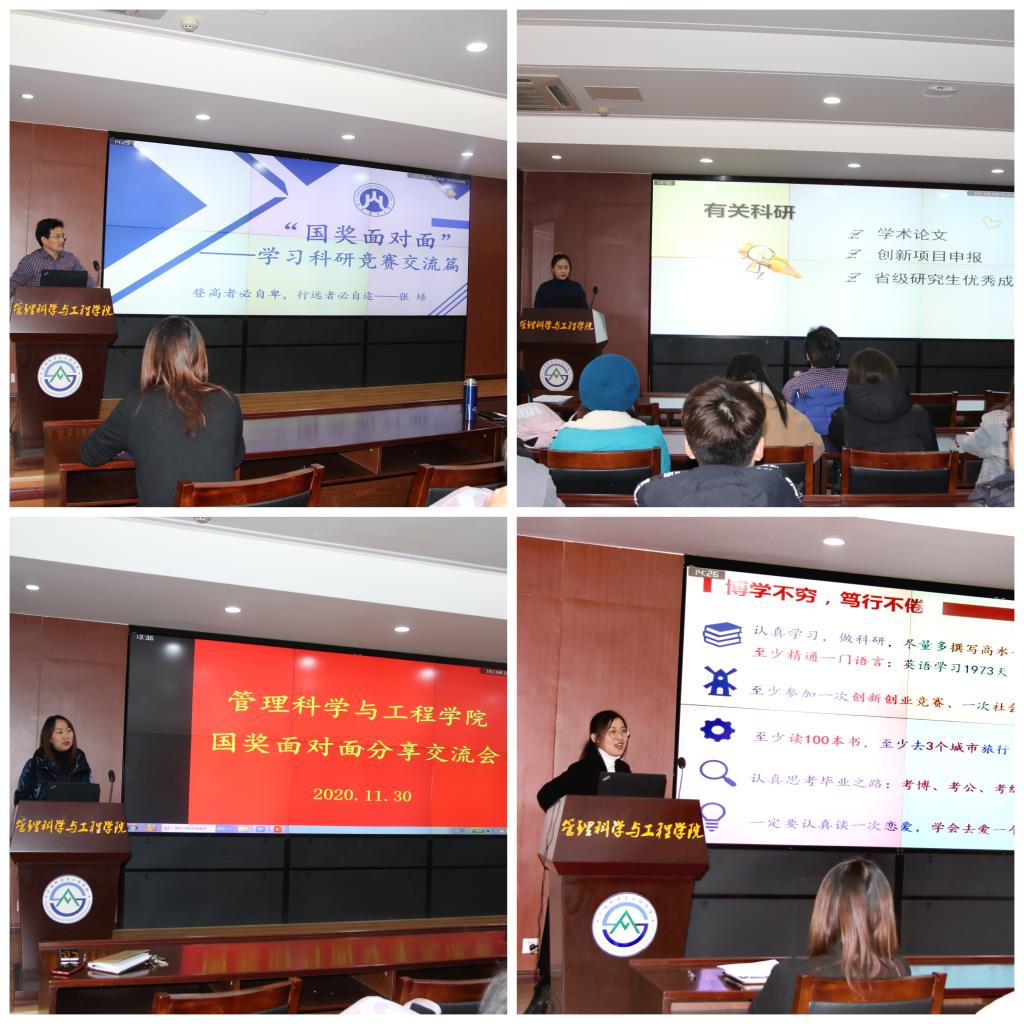 为拓宽研究生视野,促进优良学风建设,11月30日下午,公司在逸夫楼621举办研究生“国奖面对面”分享交流会。本次交流会邀请了2020年研究生国家奖学金获得者2018级管理科学与工程专业研究生李琳、张培两位同学进行经验分享,副经理刘位龙担任点评专家,交流会由研究生辅导员何丽主持,2020级全体研究生参加了此次交流会。