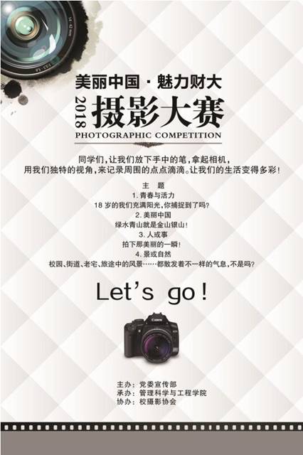 以“美丽中国·魅力财大”为主题,通过镜头发现定格生活中的美好瞬间,反映党的十八大、十九大以来国家经济社会改革发展的重大变化,展示祖国自然风光之美、文化传承之美、人间真情之美和山东财大发展历程之美,记录身边感人瞬间,表达对新时代、对美好生活的祝福与期许。